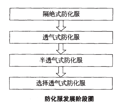 防化服的發(fā)展大體經(jīng)歷了隔絕式、透氣式、半透氣式和選擇透氣式四個階段, 如圖所示。但各個階段不是孤立的, 而是相互有聯(lián)系的。