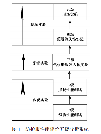 防化服的性能評(píng)價(jià)主要包含防護(hù)性能以及舒適性2個(gè)方面。 目前成熟的評(píng)價(jià)體系是五級(jí)分析系統(tǒng),如圖1所示。可以劃分為客觀評(píng)價(jià)、人體穿著實(shí)驗(yàn)以及現(xiàn)場(chǎng)實(shí)驗(yàn)3個(gè)層次。