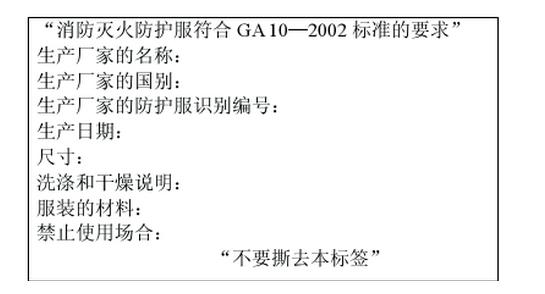2、查看消防員滅火防護服是否有標簽,查看標簽內(nèi)容是否符合規(guī)定,每一件防護服應有永久性的標簽,標簽應放置在防護上衣前胸左側(cè)的舒適層上,標簽上應提供圖中所規(guī)定的內(nèi)容。