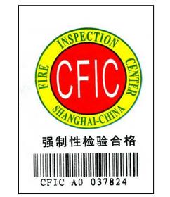 3、消防員滅火防護服作為強制檢驗產(chǎn)品,應在產(chǎn)品上加施強檢標志,應在每件消防員滅火防護服舒適層標簽旁縫制一個強檢標志,分體式的尚需在防護褲子舒適層褲袋處縫制一個相同的標志,如圖所示,尺寸應為60mm×90mm。同時,將一件新的消防員滅火防護服,平鋪在桌面上,打開拉鏈,在防護服的內(nèi)側(cè)即舒適層上查看是否有國家消防裝備質(zhì)量監(jiān)督檢驗中心的批檢標志,并記錄下批檢號,從檢驗中心網(wǎng)站上查詢該生產(chǎn)企業(yè)的批檢合格號碼的范圍,確認其真實性。