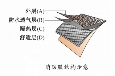 消防服由外層(A )、防 透 氣 層 (B )、隔熱層 (C)、舒適層(D)等層復(fù)合而成。阻燃性是外層 的基本要求;防透氣層的作用主要是防或有害物質(zhì)滲入,并將人體產(chǎn)生的汗液和濕氣及時(shí)排出;隔熱層要求具備良好的隔熱、防熱輻射性;舒適層提供與人體接觸的舒適性。多層織物復(fù)合形成消防服,需提供的主要性能是整體熱防護(hù)性、透水蒸氣性和舒適性。